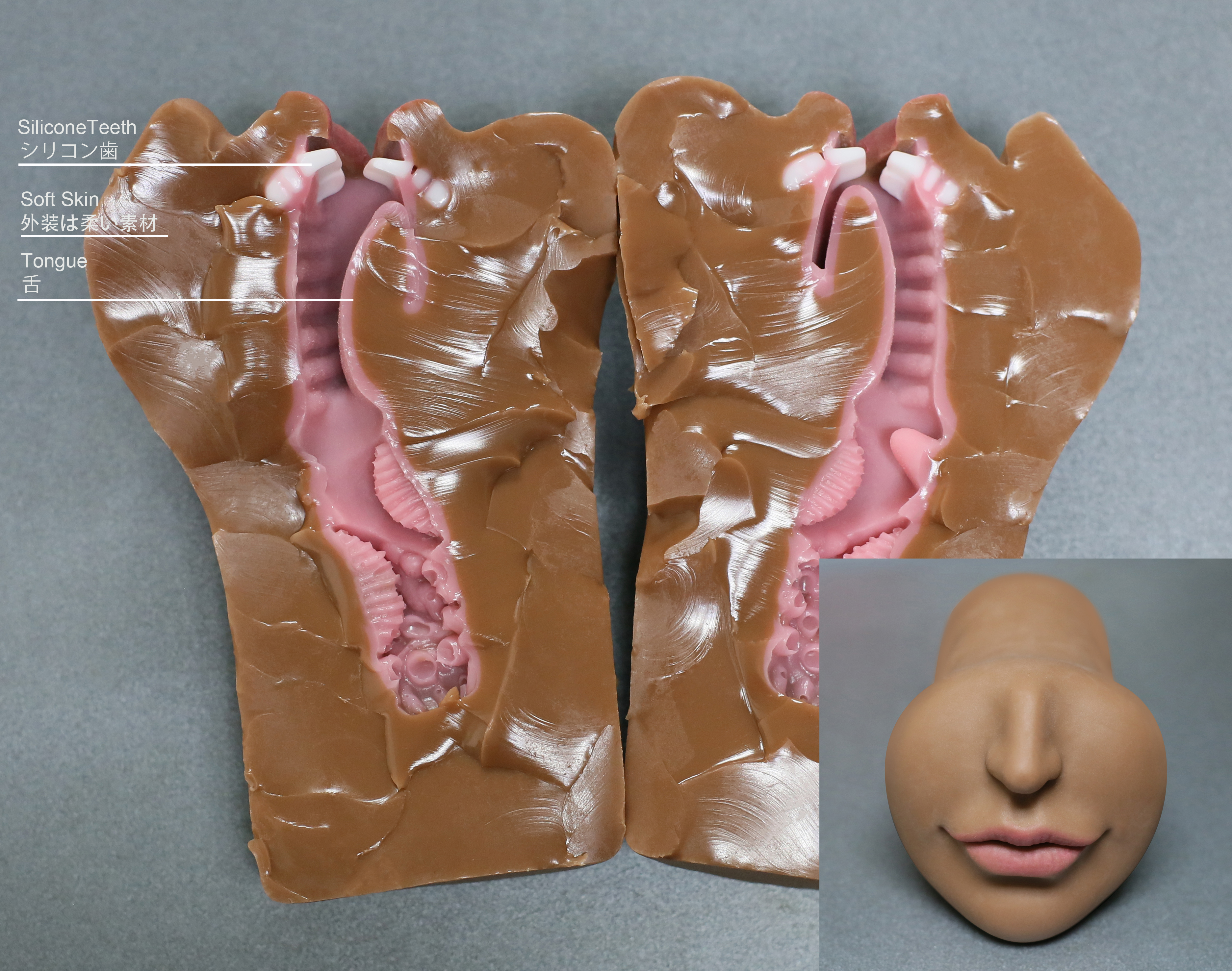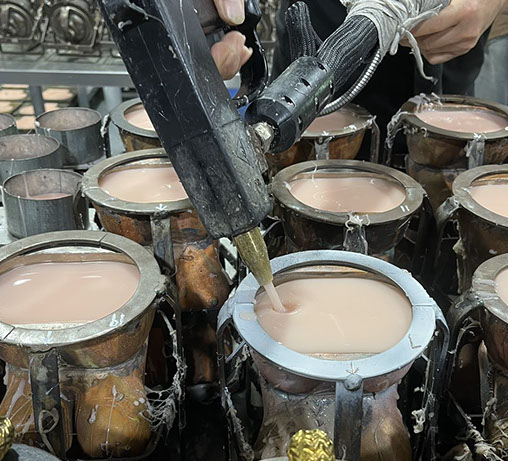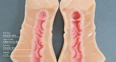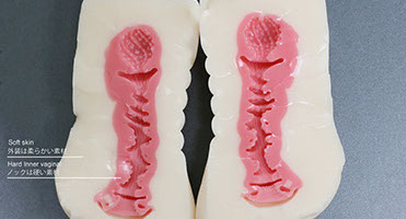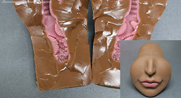 Right hand side picture show heated raw material for filling moulds streams from a pipe at the our Masturbator sex toy factory in DongGuang.